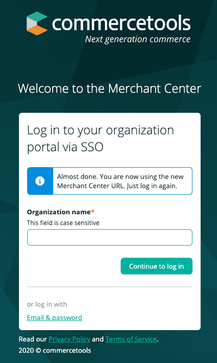 - You get redirected to the SSO login page of the new Merchant Center URL with your organization name prefilled. Click Continue to login.